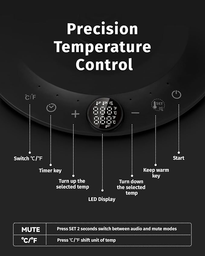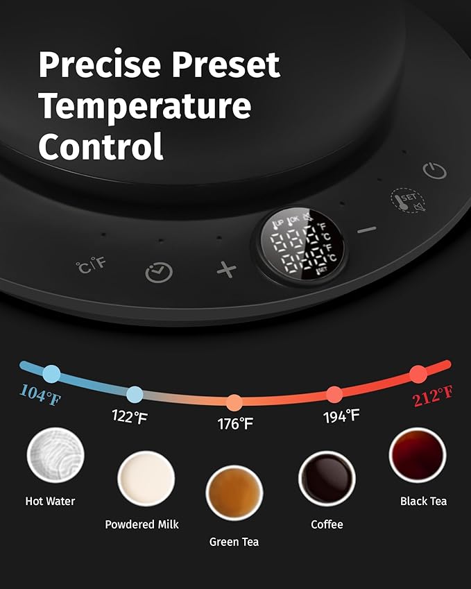 - Hold Your Heat: After boiling, press "SET" to enter Keep Warm mode and maintain your desired water temperature. Use the "+" and "-" buttons to fine-tune the hold temperature between 104°F and 212°F (40°C to 100°C). Perfect for pour-over coffee, delicate teas, instant oatmeal, or keeping hot water ready throughout the day, no need to reheat between brews