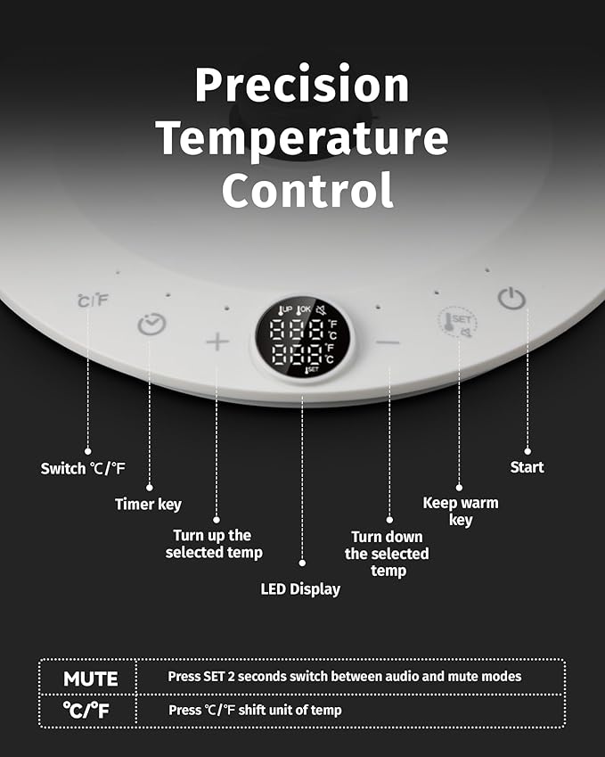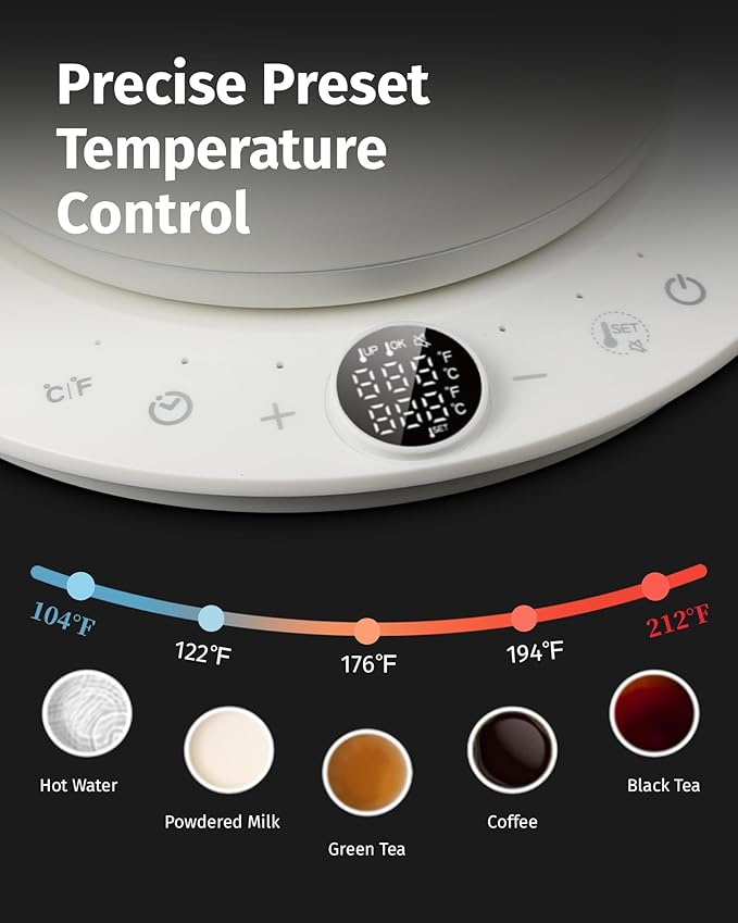 - Hold Your Heat: After boiling, press "SET" to enter Keep Warm mode and maintain your desired water temperature. Use the "+" and "-" buttons to fine-tune the hold temperature between 104°F and 212°F (40°C to 100°C). Perfect for pour-over coffee, delicate teas, instant oatmeal, or keeping hot water ready throughout the day, no need to reheat between brews