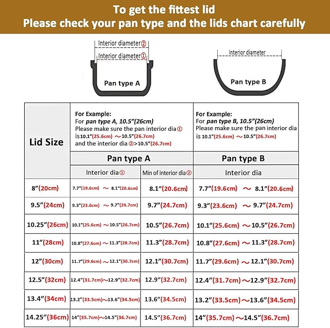 - FITs ALL: Tempered glass lids designed to fit multiple pot and pan sizes, providing versatile coverage for your cookware needs, 8 inch, 9.25 inch, 10.5 inch, 11inch, 12 inch, 12.5 inch, 13.5 inch, 14 inch for all the pans and pots in your kitchen