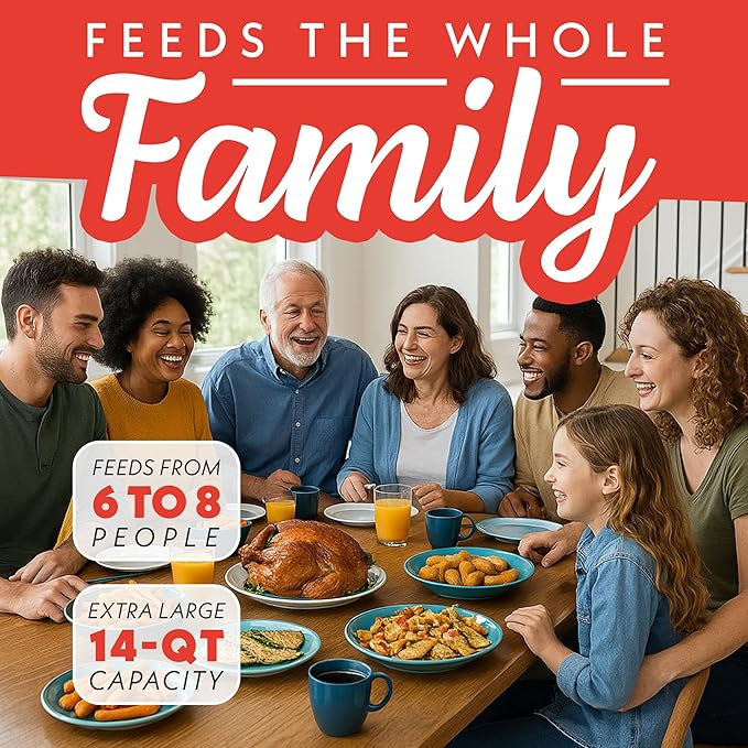 - Spacious Family-Sized Capacity – The 14-quart chamber fits a 4 lb whole chicken or a 12″ pizza—perfect for batch cooking and weeknight dinners for 4–6 people