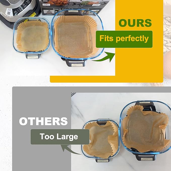 - Healthy and Reliable Material: Ninja air fryer liners disposable are made out of unbleached, natural wood pulp, with a plant based oil treatment, no fluorescent agent, BPA-free, PFAs-free. 12% thicker than ordinary parchment to be durable and sturdy. Heat resistant up to 450℉/230℃.