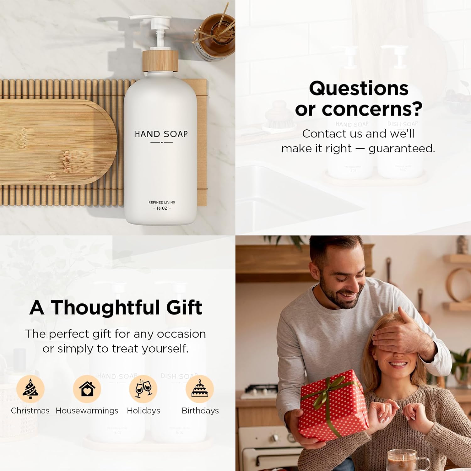 Hand and Dish Soap Dispenser Set,16oz Glass Bottles with Printed Labels, Bamboo Tray & Pump,Countertop Soap Dispensers for Kitchen,Luxury, Minimalist & Farmhouse Decor (Hand Dish (White))