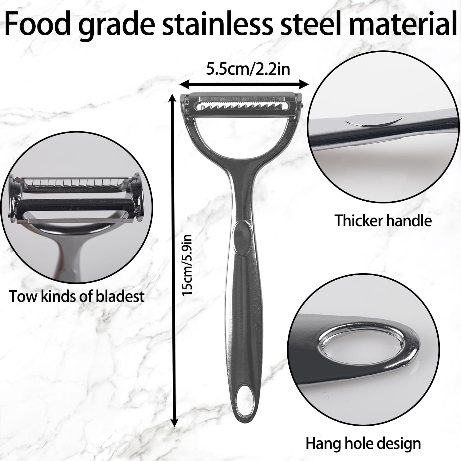 - 3. Precision Peeling Made Easy: The 2-in-1 peeler has a Y-shaped design with a straight and julienne blade for smooth, controlled peeling. Works with both hands and glides effortlessly over fruit and vegetable surfaces without waste.