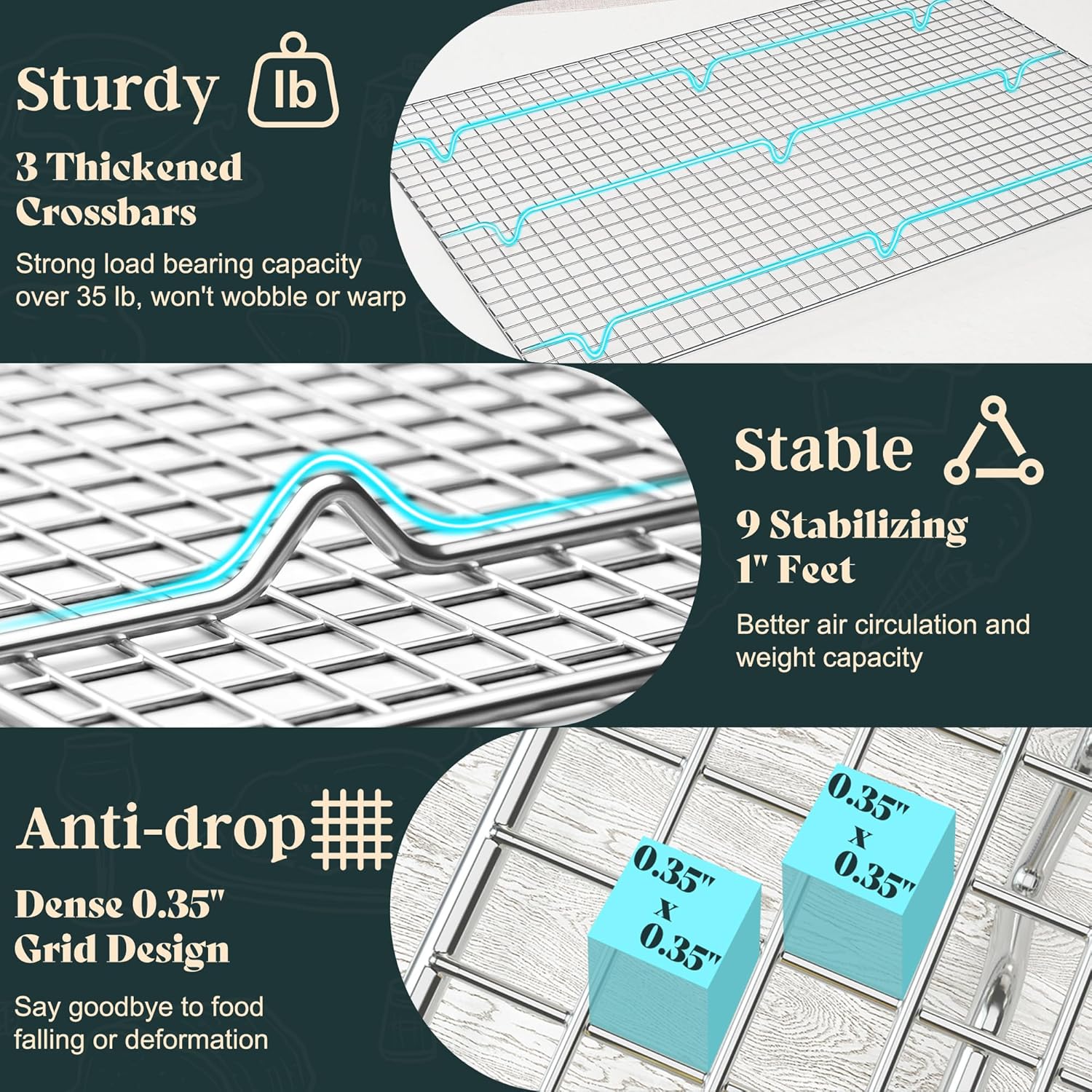 - TRUSTWORTHY MATERIALS: Our wire cooling rack is made entirely of food-grade 304 stainless steel, with narrow mesh, smooth edges, and uniquely designed vertical support rods, making our racks more heavy-duty and more stable