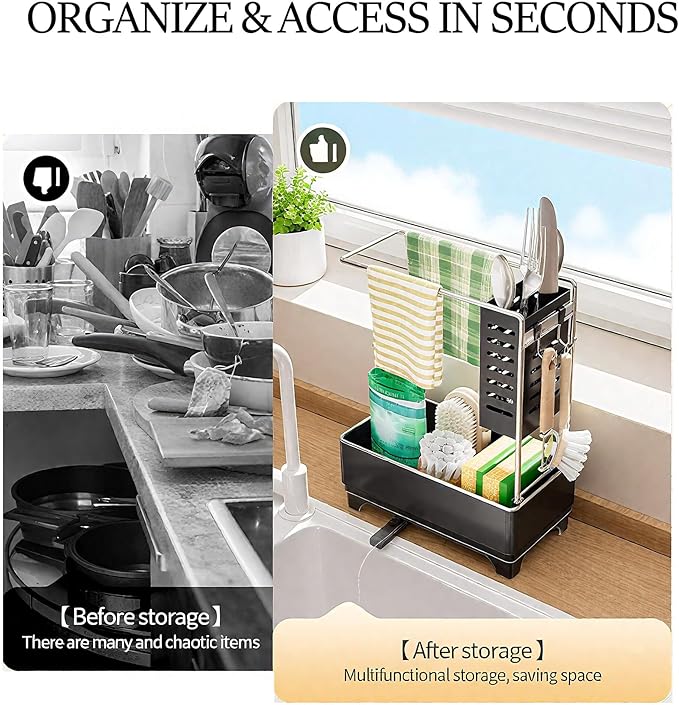 - Fit for Kitchen Sink & Countertop: Designed specifically for kitchen sink surroundings, this compact caddy fits snugly next to your sink or on the countertop without taking up too much space. Ideal for small kitchens, apartments, or new homes needing efficient storage solutions.