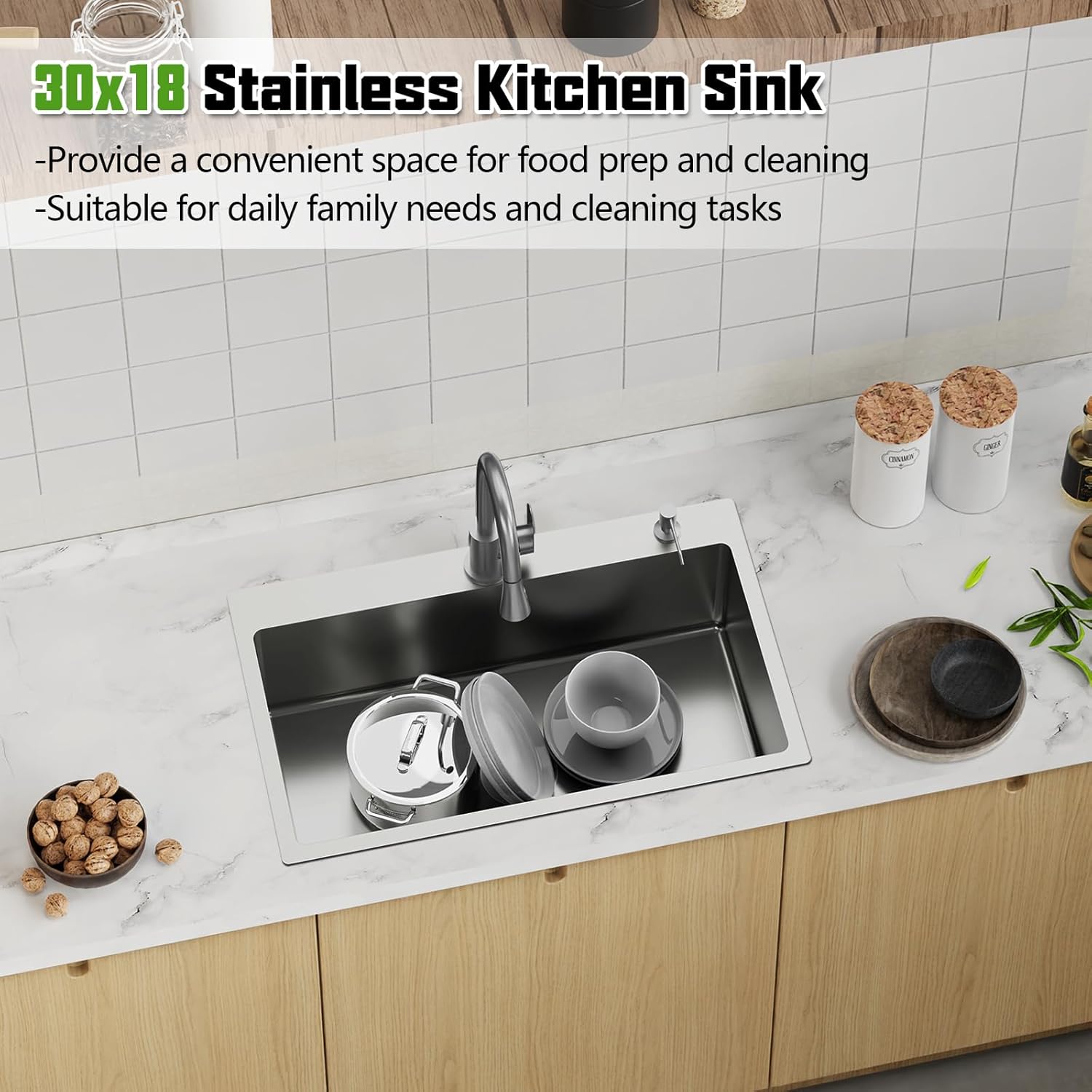 - Versatile Compatibility: 30x18 in kitchen sink can work well with various countertop materials, such as granite, quartz, or marble. Stainless steel kitchen sink complement various kitchen styles and designs. Whether you have a contemporary, traditional, modern kitchen or bar, a stainless steel sink can seamlessly integrate into your aesthetic.