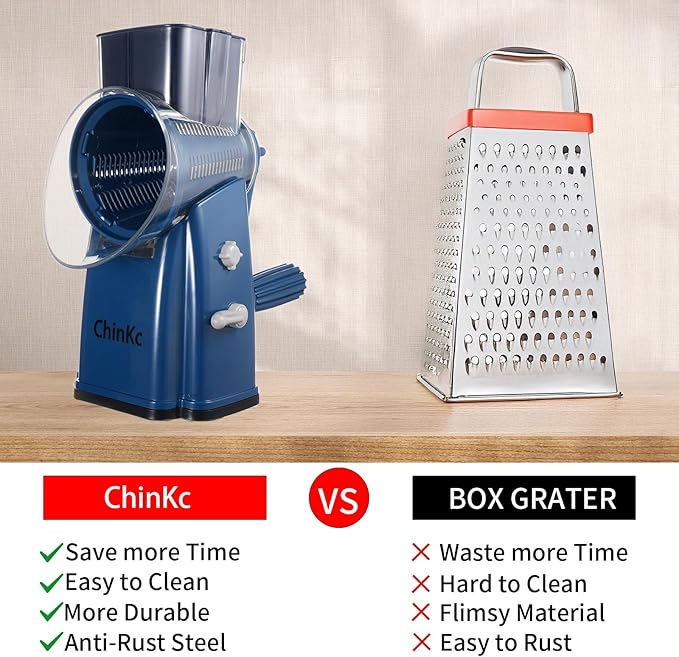 - โ Important Tipsโ : Compared with the grater currently on the market, we have made three improvements and upgrades, namely: 1. 180ยฐ Rotation boosts suction and stability. 2.Larger chute reduces spillage. 3.Single-direction food pusher prevents errors.