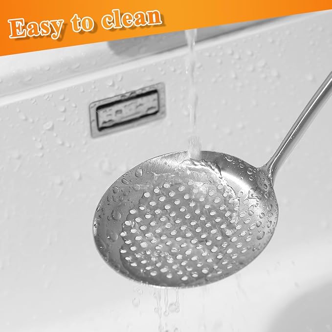 - 4. Effortless Cleaning and Maintenance: This stainless steel skimmer is dishwasher safe, saving you time and effort in the kitchen. Simply place it in the dishwasher after use for a thorough clean, or wash it by hand with warm soapy water. Its smooth surface resists stains and food buildup, ensuring it remains in pristine condition with minimal maintenance.