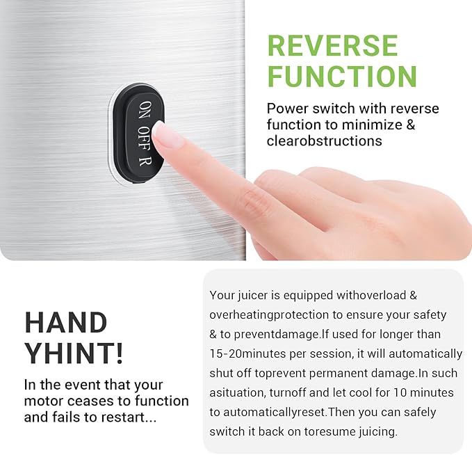 - [3.1-Inch Reversible Wide Chute & Auto-Cutting Power]: Our 3.1-inch feed chute is perfectly sized to accommodate whole apples and veggies—no need for pre-cutting. Thanks to the powerful auto-cutting mechanism with dual crushing blades, your ingredients are sliced and juiced in a flash, saving you time and maximizing every drop of juice.