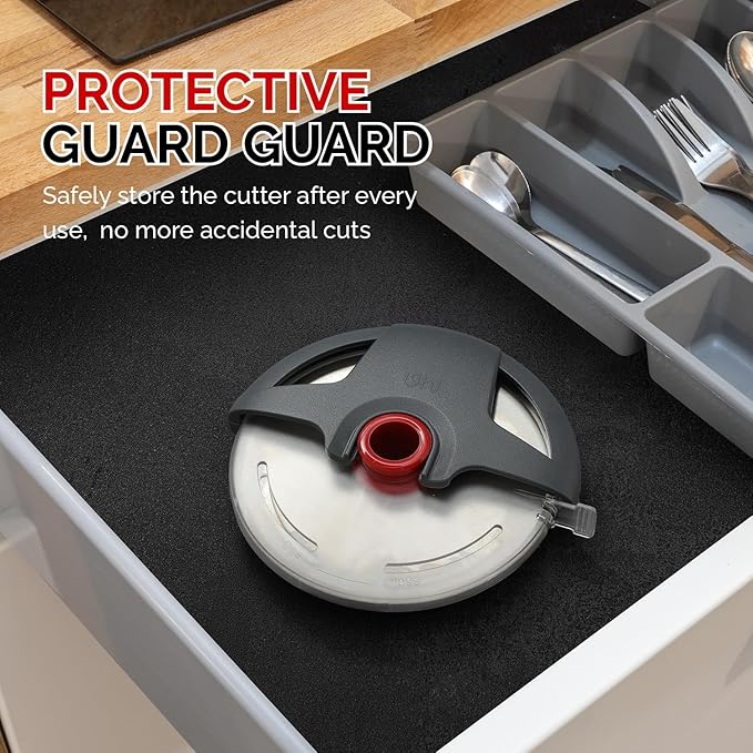 - Larger 4.3” Cutting Wheel - Oversized blade slices through thick or thin crusts in one smooth motion, without dragging off your toppings.