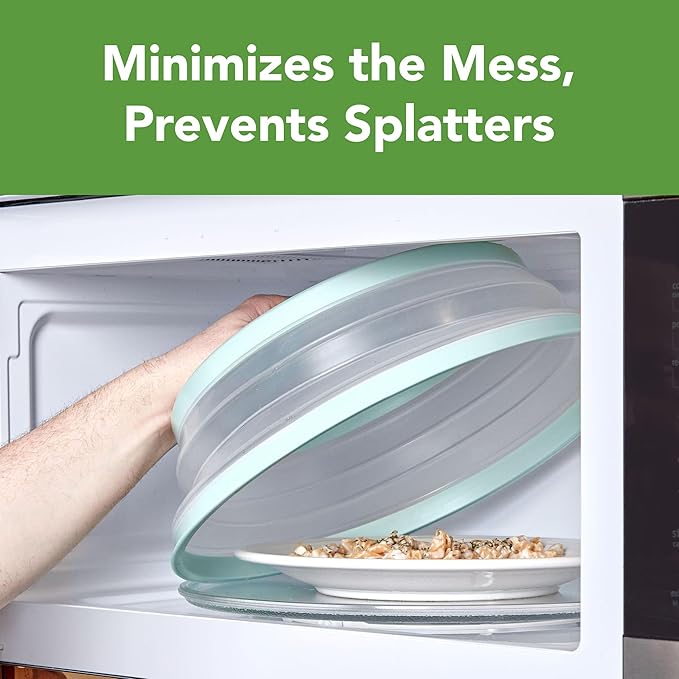 - Collapsible for Easy Storage: This collapsible cover pops up to 3" to cover tall dishes, piles of food, and shallow bowls. The cover collapses to 0.75" for easy storage. Cover can also be used flat to cover large bowls to prevent splattering.