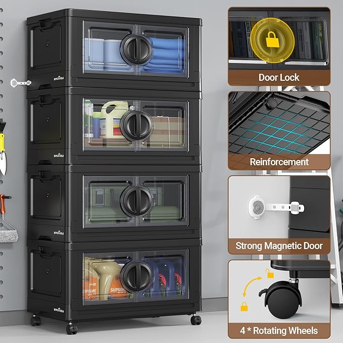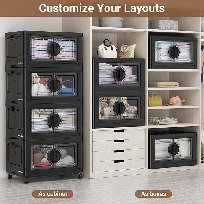 480Qt Lockable Stackable Storage Bins with Lids, Closet Organizers and Storage Drawer, Collapsible Storage Bin with Wheels, Plastic Cabinet for Toy Clothes Dorm Organizer, V9 4 Pack Black