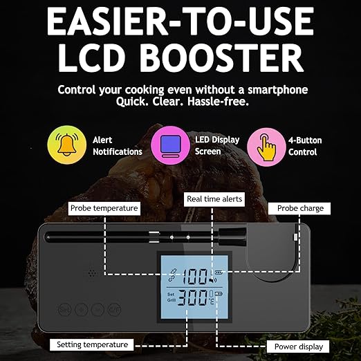 - 📺 Clear LCD Booster Display – Instant Read, No Phone Needed: Check temps directly on the booster’s LCD screen—perfect for quick monitoring. Unlike many digital meat thermometers, this bluetooth meat thermometer wireless delivers fast, accurate readings without needing your phone open.