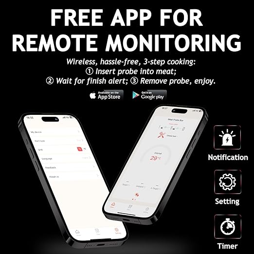 - đź”” Real-Time Smart Alerts + Long Battery Life: Get instant doneness alerts on your phone. Keep the app active and battery saver off for best results. With over 28 hours per charge and a 2-year warranty, JOPCPIE is your reliable wireless thermometer for grilling.