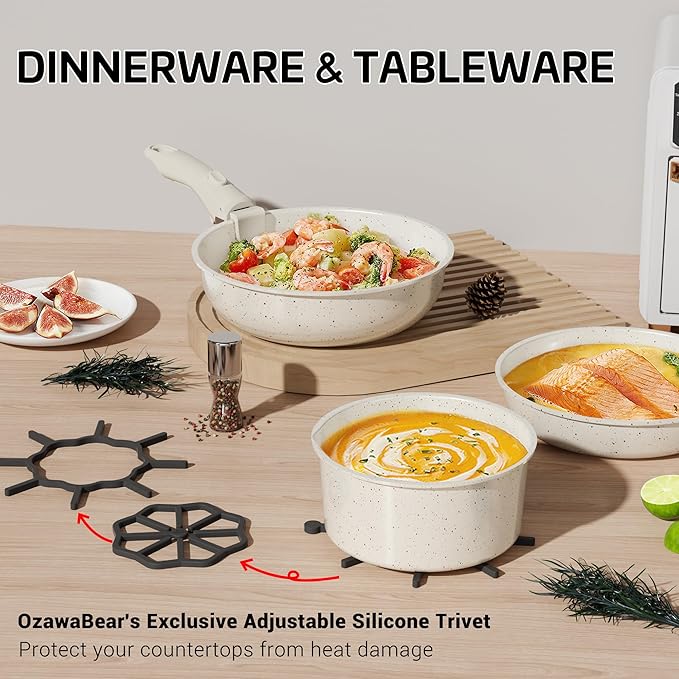 - Functional Cookware Set: Use as tableware, bakeware, dinnerware, grill pans, or fridge storage (with lid). Includes OzawaBear's exclusive adjustable silicone trivet to protect your countertops from heat damage.