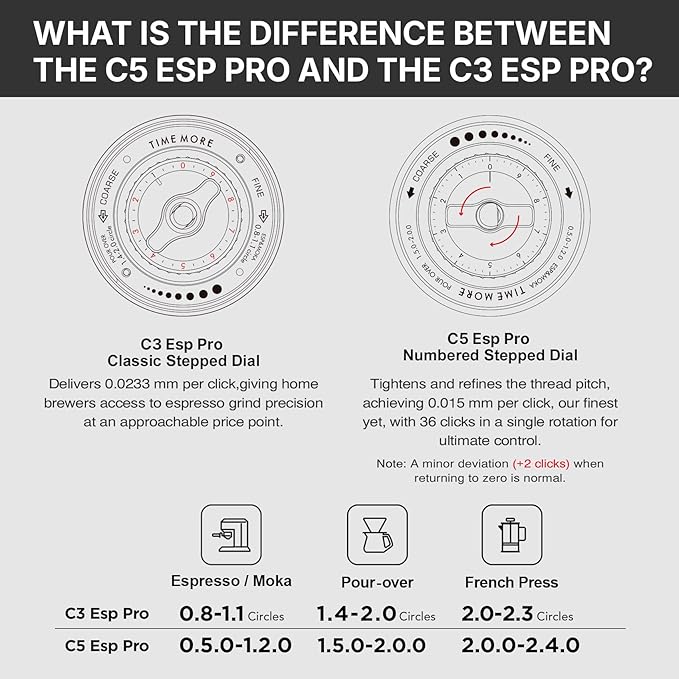 - [ What is C5 ESP Pro? Special Design For Espresso ]Equipped with patented S2C-420-III stainless steel burrs with higher precision and efficiency. C5 ESP Pro hand coffee grinder provides more precise grinding adjustment, minor adjustment of 0.015mm per click allows you to easily achieve the perfect coarseness for your preferred fine to coarse. From French press to espresso coffee, TIMEMORE has you covered