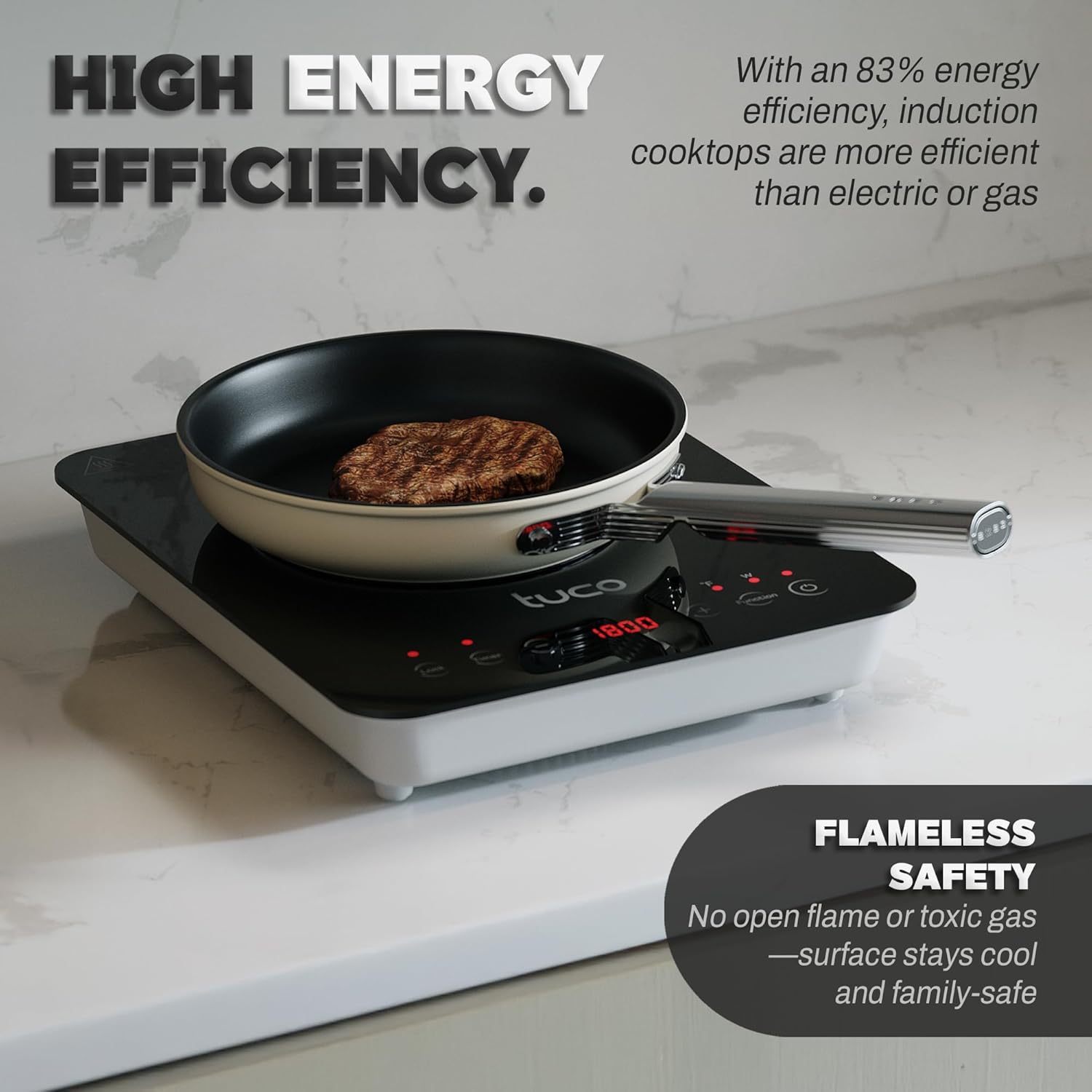 - ⚡ FASTER HEATING & ENERGY SAVINGS: The TUCO Portable Induction Cooktop achieves up to 83% energy efficiency, outperforming gas and electric stoves. It heats cookware directly using electromagnetic fields, reducing heat loss and ensuring rapid heat-up with less energy waste.