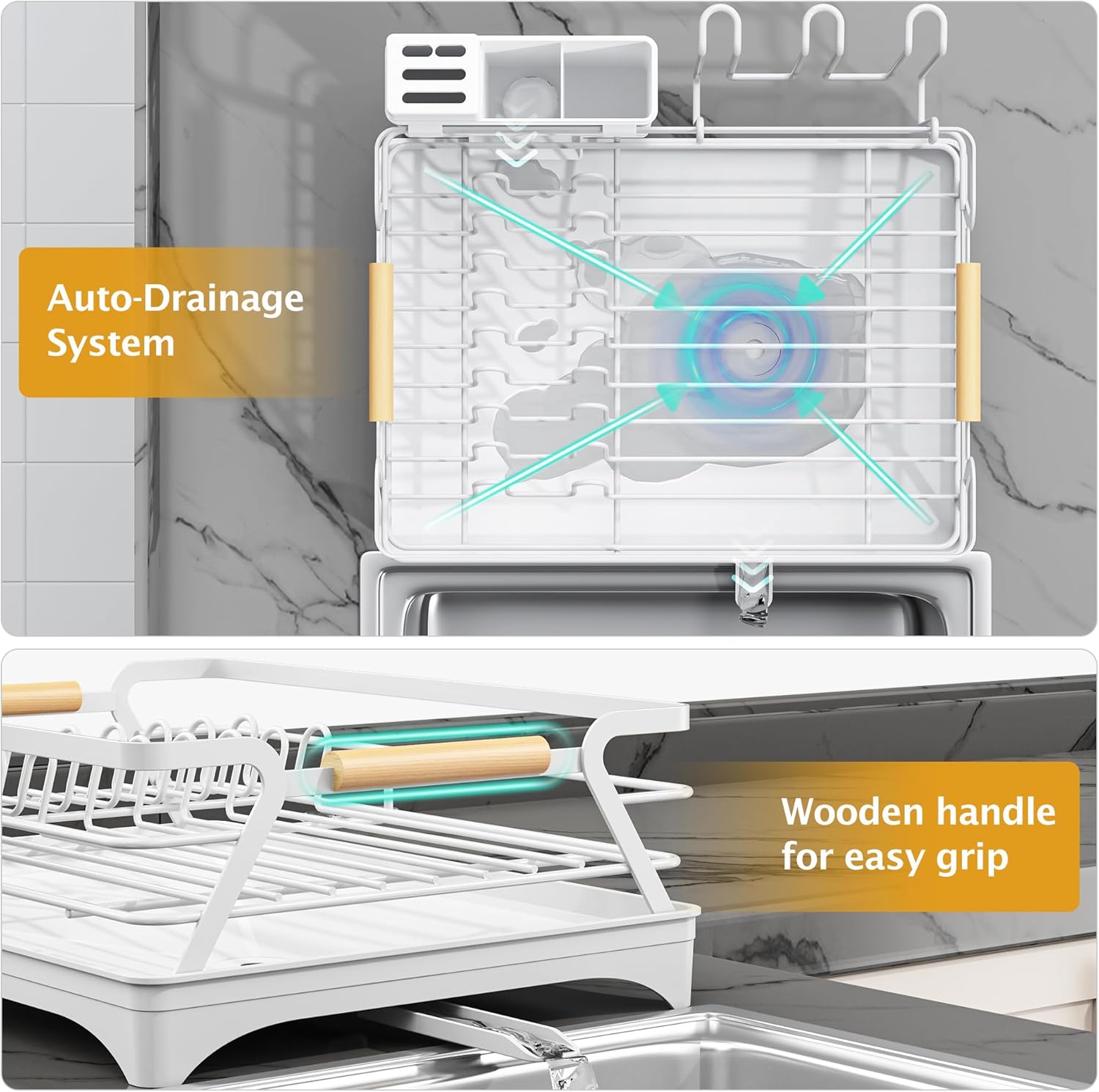 - ERGONOMIC WOODEN HANDLE: Unlike other dish racks, this one is thoughtfully equipped with an ergonomic handle. It won't cause discomfort and makes it easy to move.