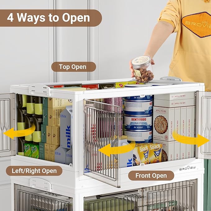 - 【Four Ways Opening and Magnetic Closure】The plastic storage bins with lids feature 4x opening methods - front double doors, right door, left door, or top lid opening. The front and side door with magnetic design are convenient for daily access, while the lids with latch is convenient for taking larger items such as quilts and blankets.