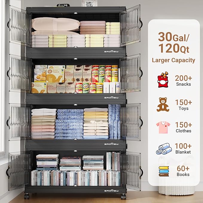 - 【Patent 4x Doors - Side and Front Open】Each V8-Pro stackable storage bins with lids measures 27.5x 16.7x 15.5inches and holds up to 120quart/30gallon. The large storage bins with Doors x4 can be opened both at the front and at the side, so you can place it as you like according to your space, making daily storage and retrieval hassle-free.
