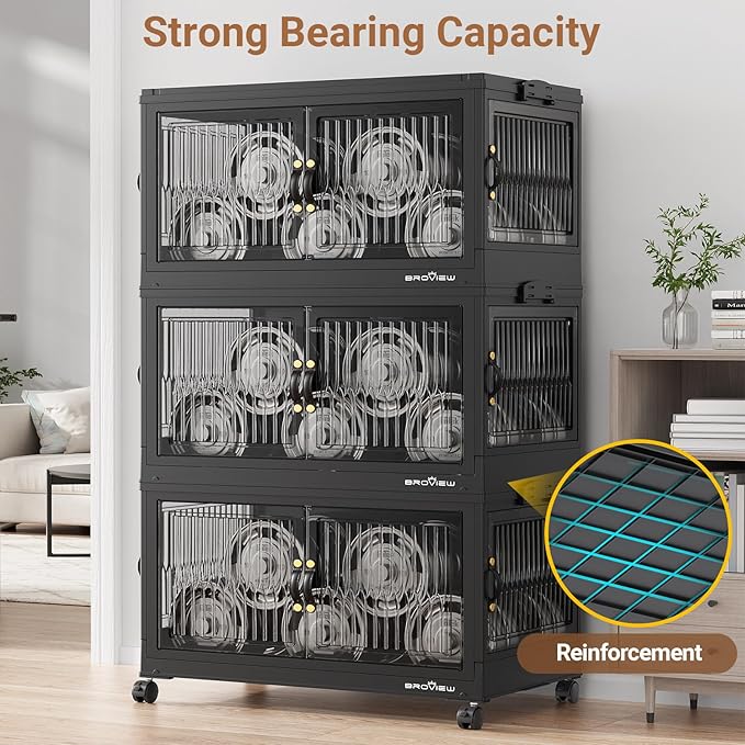 360QT Large Stackable Storage Bins with Lids, Plastic Closet Organizer and Storage Drawer, Collapsible Storage Box with Wheels, Folding Storage Cabinet with Doors for Home Kitchen, 3Pack Black