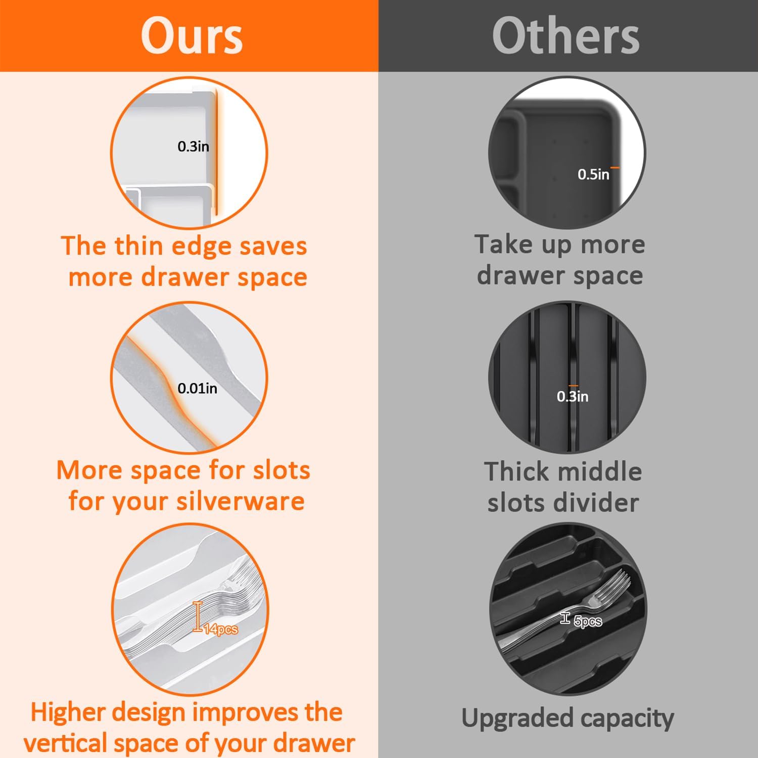 - Maximize Drawer Space: With our 3-way expandable design, our white silverware organizer offers unparalleled flexibility, allowing for left, right, and upward expansion. This transforms it from a compact tray to a full-sized storage solution. All the edges are thinner than those of other flatware organizers, which magnifies your kitchen drawer storage space