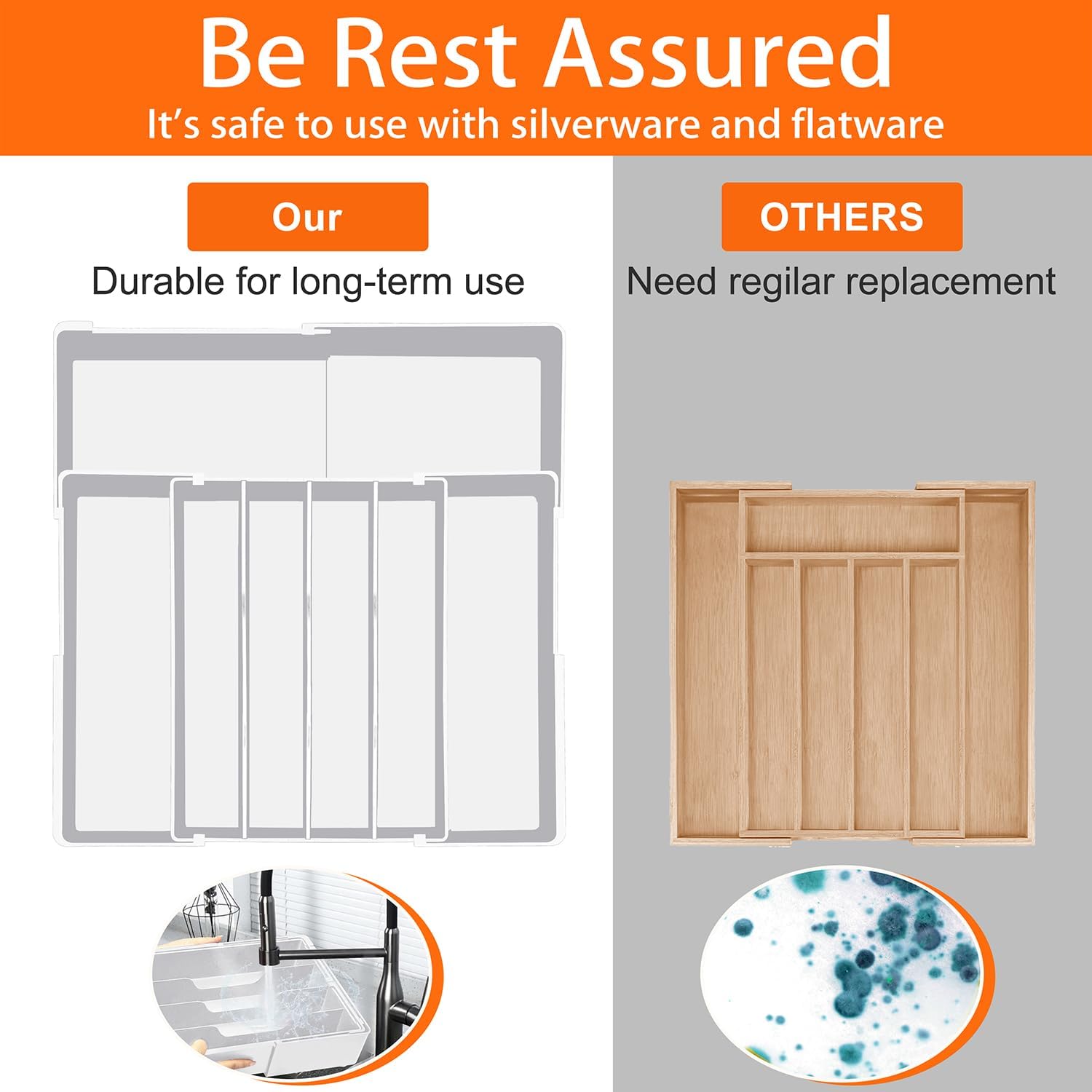 - Durable & Safe Material: Crafted from food-safe ABS plastic material, this silverware drawer organizer tray is BPA-free, shatter-resistant, waterproof, and built to last. Our utensil tray's smooth edges protect utensils from scratches, while the sturdy construction withstands daily use—making it a reliable drawer utensil organizer for years to come