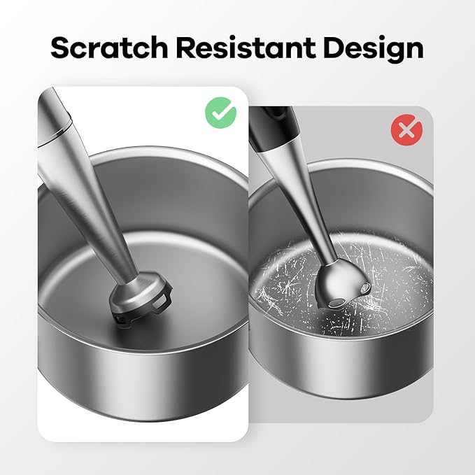 - Protect Your Cookware: This immersion blender handheld has a bell shaped base and food-grade nylon blade guard to protect your pots and pans from scratches and extend the life of kitchen tools. It also can prevents splatter to keep your clothes and kitchen clean