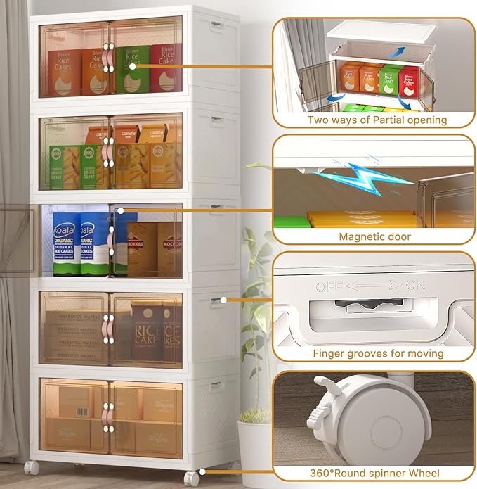 - EACH 2.6INCH FOLDABLE & TOOLS-FREE ASSEMBLY: Setting up these stackable storage bins with doors is quick and simple—NO TOOLS NEEDED. You can have them ready to use in just minutes.Easily fold down to JUST 2.6 inches each tiers when not in use. Especially when you want to move house, you don't need to move bulky cabinets and worry about them being damaged due to transportation. It is a good alternative idea to fixed furniture cabinets and small miscellaneous boxes!