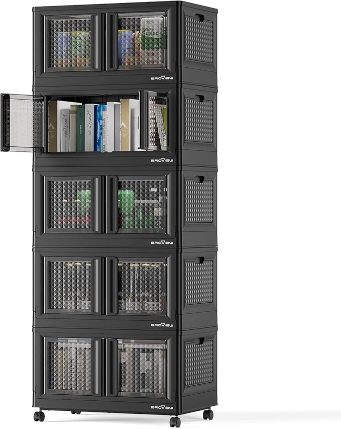 500Qt Stackable Storage Bins with Lids, 125Gal Closet Organizers and Storage Drawer, Plastic Collapsible Storage Bins with Doors, Heavy Duty Store Box Cabinet for Home Office, 5Pack Black
