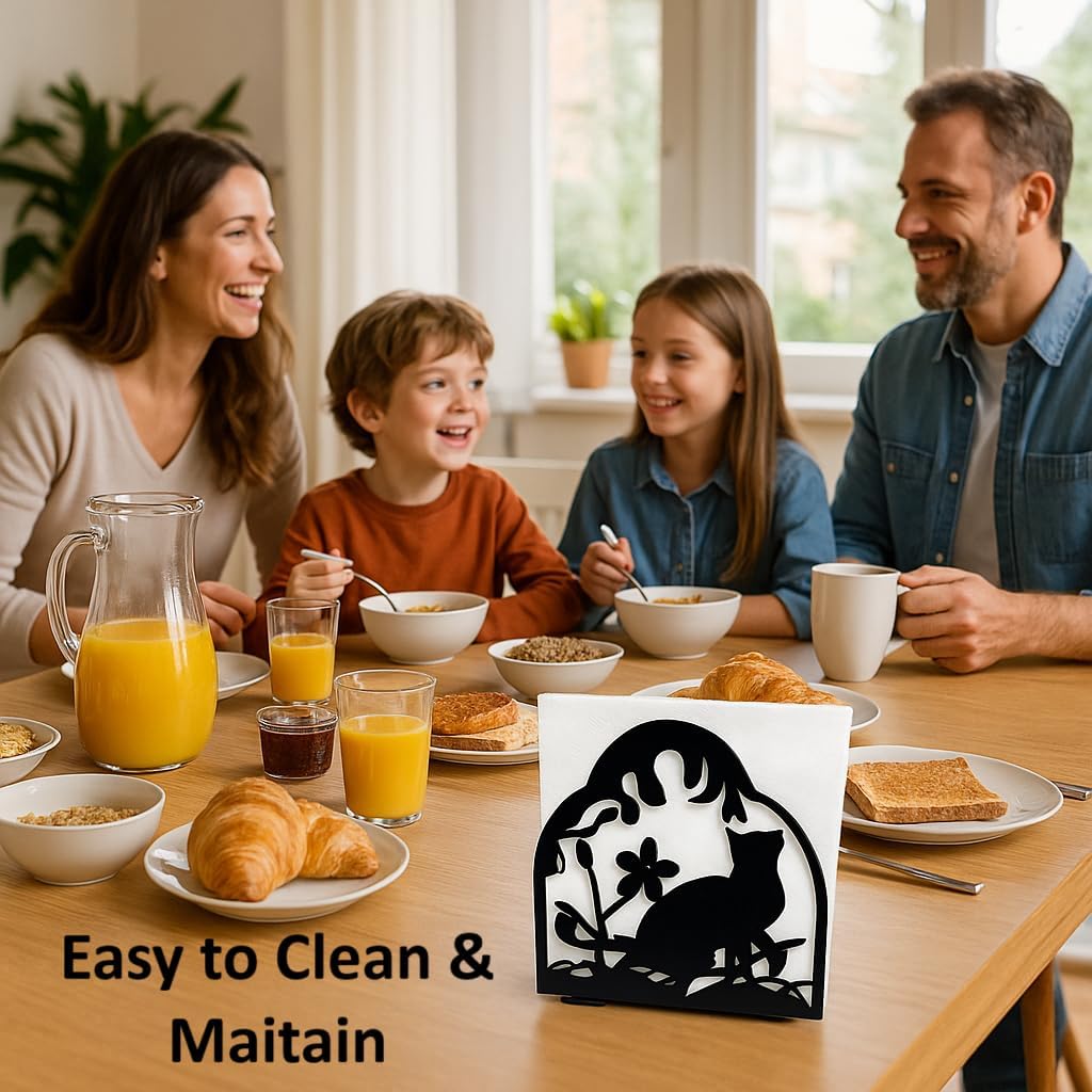 Decorative Metal Napkin Holder Set – Cat & Floral Design – 2 Sizes for Everyday & Cocktail Napkins – Black Modern Kitchen Coffee Filter Holder for Size #2 & #4 coffee filters.