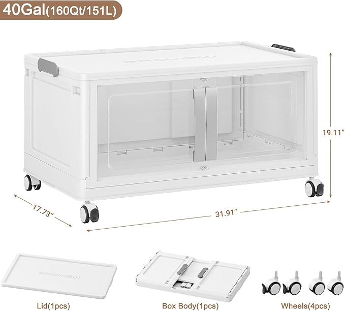 160QT Stackable Storage Bins with Lids, 40Gal Extra Large Collapsible Storage Box with Wheel, Plastic Storages with Clear Door Open Front for Home Bedroom Garage, White-1pack(1 lid)