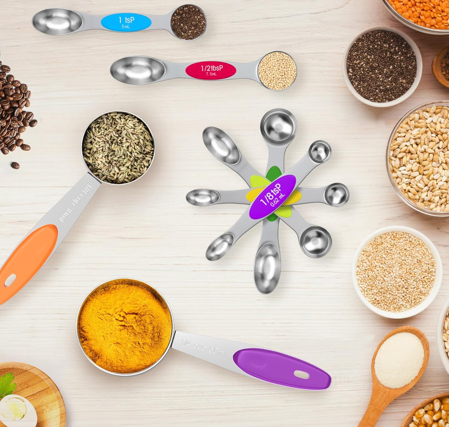 - 【Easy-to-Read & Accurate】Each cup and spoon features clear markings that will not fade over time. Double-sided spoons allow you to measure both dry and liquid ingredients, and the narrow end fits into small spice jars to reduce mess and waste.