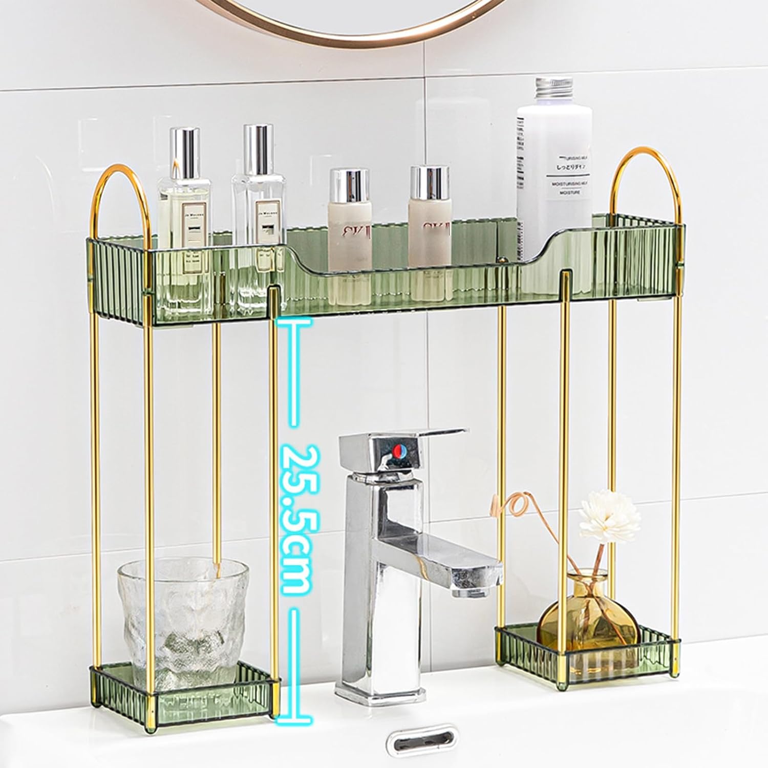 - Durable Bathroom Organizer Rack β Made with a sturdy gold metal frame and premium green plastic trays, this bathroom sink organizer is rust-resistant, waterproof, and perfect for humid bathroom environments.