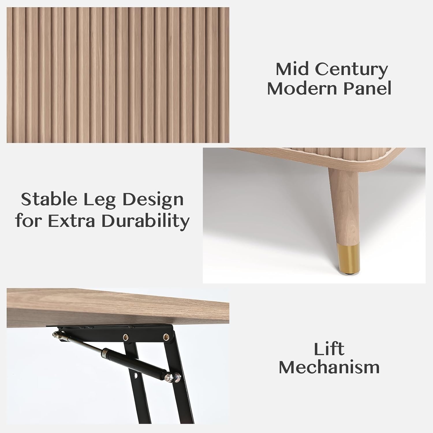 Lift Top Coffee Table, Mid Century Modern Coffee Table with Hidden Storage Compartment, 38" Fluted Center Table for Living Room, Home Office, Natural Oak