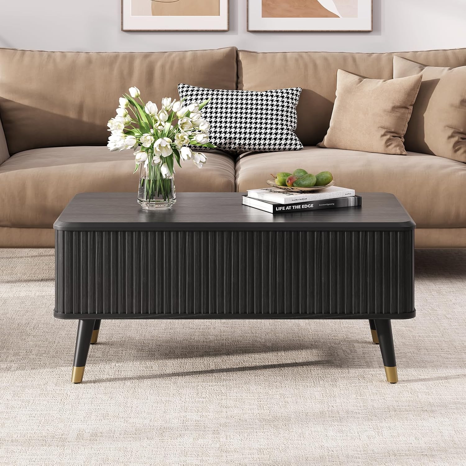 Lift Top Coffee Table, Mid Century Modern Coffee Table with Hidden Storage Compartment, 38" Fluted Center Table for Living Room, Home Office, Black
