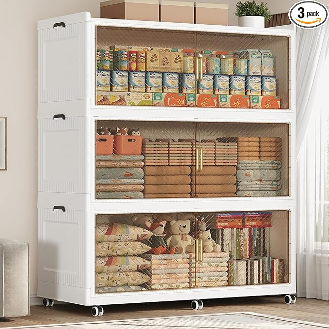 - 【Foldable, Stackable, Quick Assembly】Our large plastic storage bins can be quickly unfolded or collapsed in just 3 minutes to maximize space utilization. It can be stacked layer by layer into a cabinet, with side buckles to secure each level in place, preventing tipping or scattering. An essential large storage cabinet for homes and dorms.