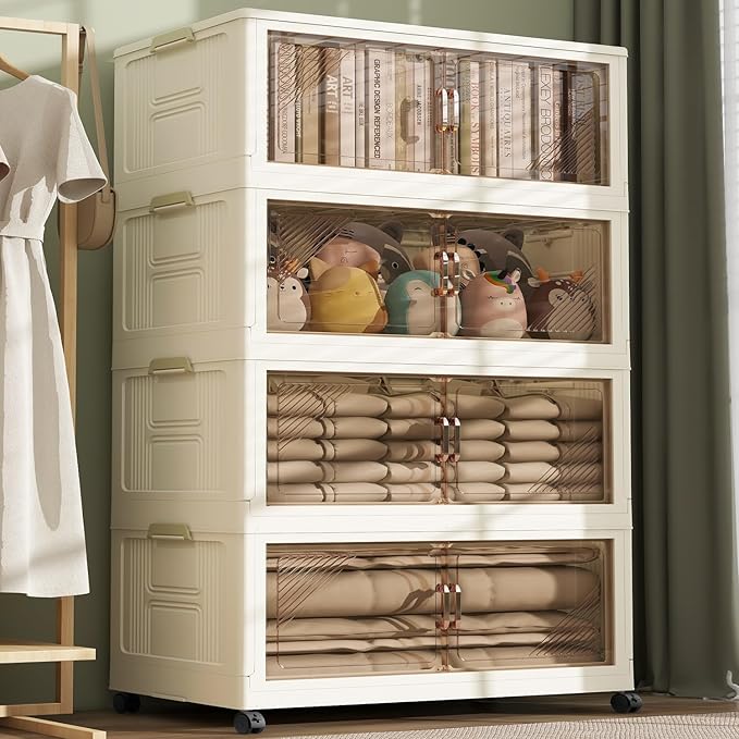 KHNR 4Packs Stackable Storage Bins with Lid, 36 Gal Closet Organizer and Storaging Drawer, Collapsible Storage Box with Wheels, Plastic Clothes Storage Cabinet Containers for Home and Office