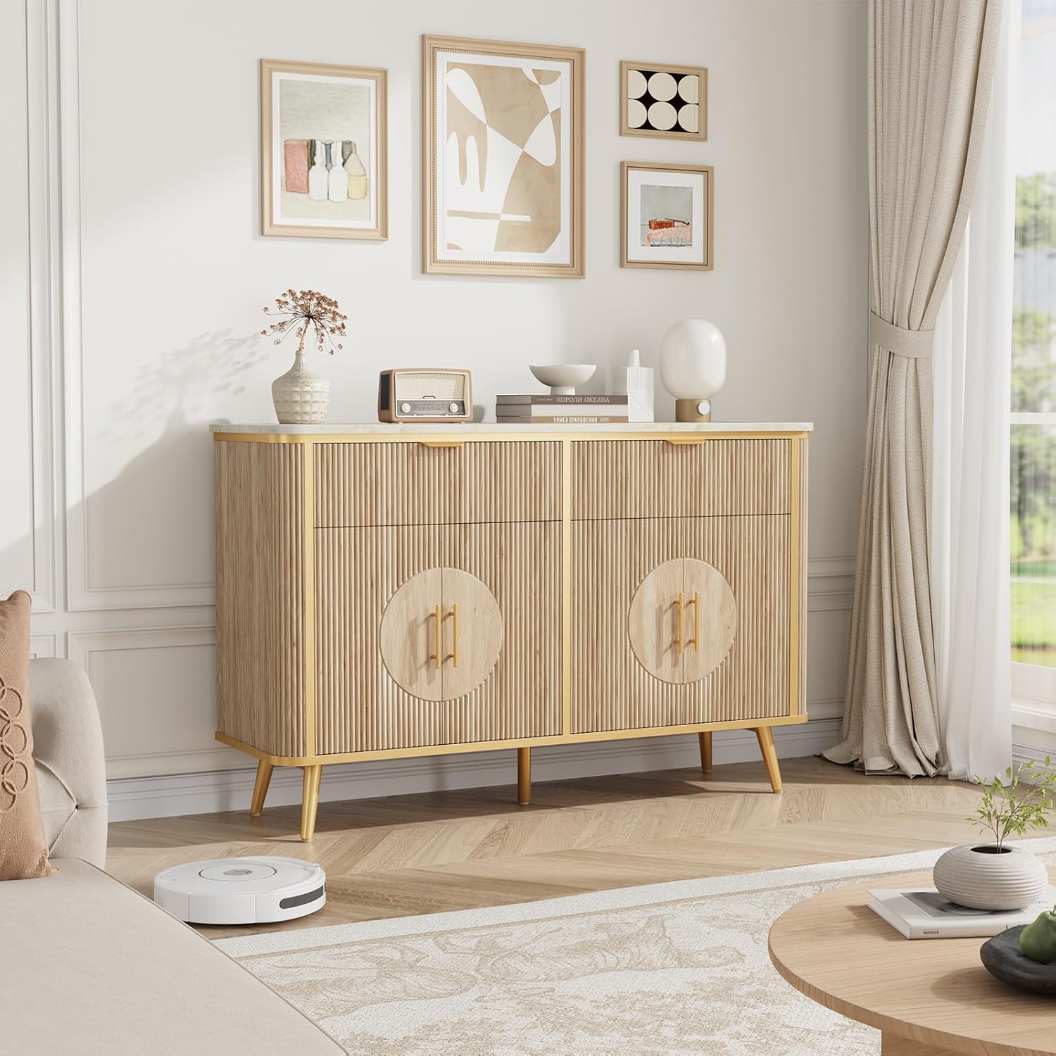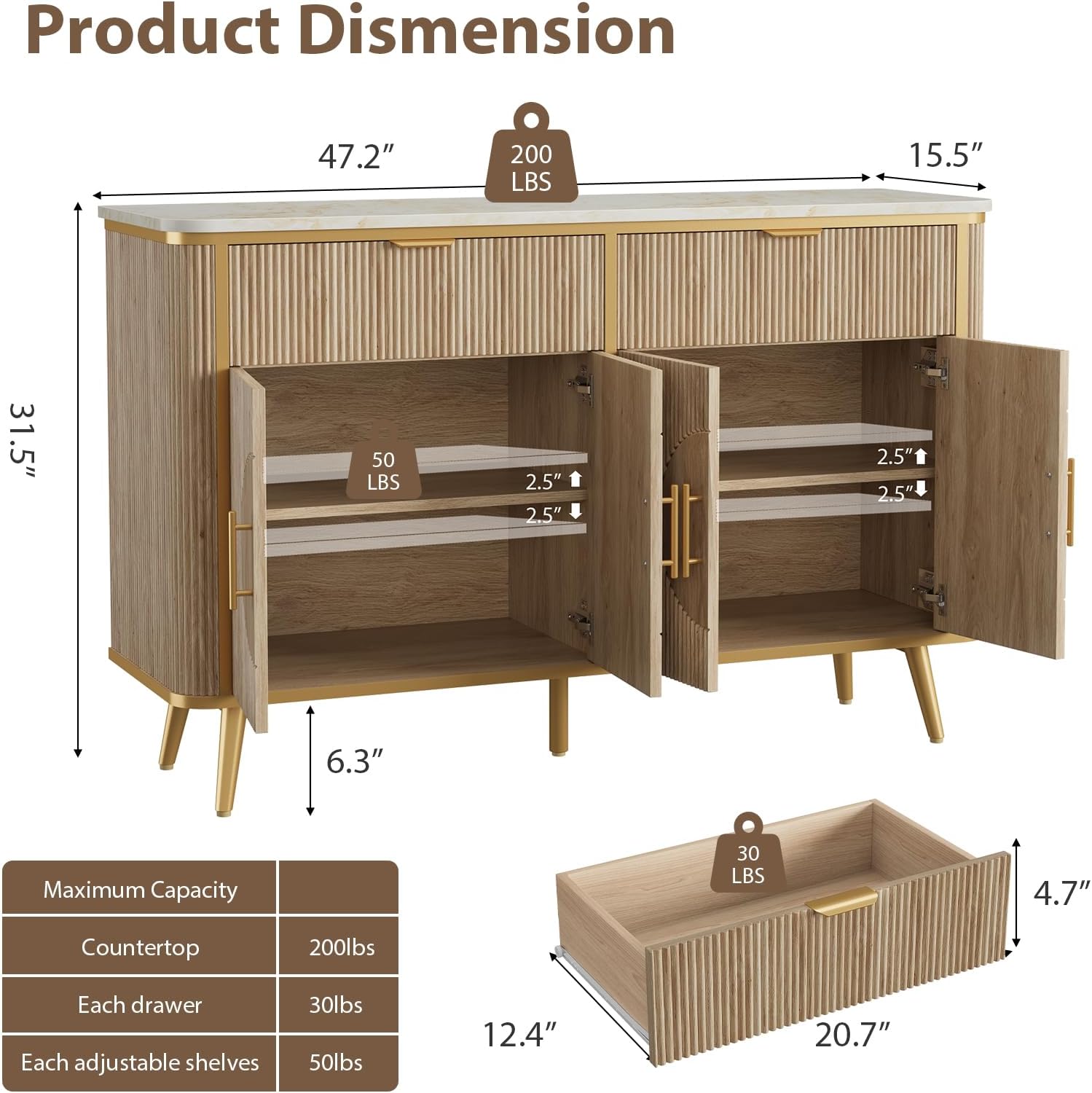 - Durable & Stable constructionāAdapting solid high-grade engineered materials, the buffet sideboard cabinet can safely support up to 200 lbs, ensuring your belongings are stored securely. The countertop is scratch-resistant and waterproof, effortlessly withstanding daily wear and stains. Additionally, the reinforced splayed legs provide ample space for the robot vacuum to clean, helping your room stay clean and tidy daily!