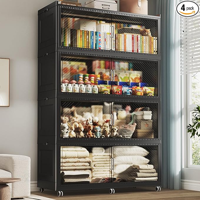 - 【Foldable, Stackable, Quick Assembly】Our large plastic storage bins can be quickly unfolded or collapsed in just 3 minutes to maximize space utilization. It can be stacked layer by layer into a cabinet, with side buckles to secure each level in place, preventing tipping or scattering. An essential large storage cabinet for homes and dorms.