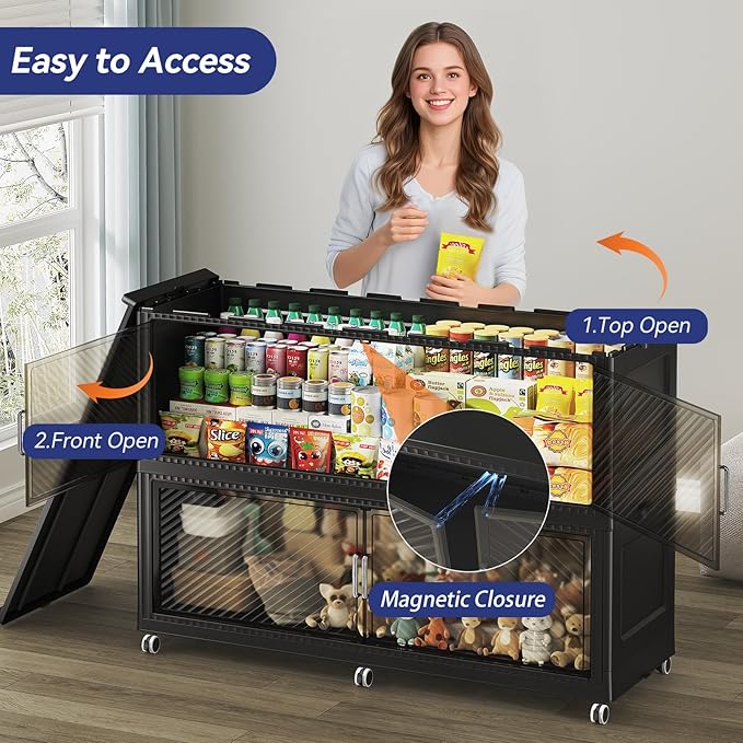 - 【Two Ways to Open & Magnetic Doors】The collapsible storage bins with lids and wheels feature a dual access way, allowing for both top and front door openings, and with clear brown windows for easy visibility. The super huge storage bins with open front doors are equipped with magnetic lock buckles to prevent dust from entering the cabinet.