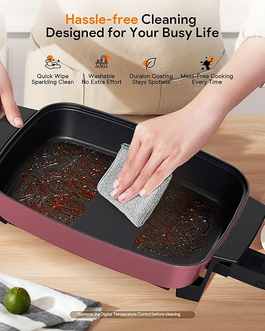 - PORTABLE AND VERSATILE – As long as there’s access to an outlet, you can cook on almost any flat surface. Easily store the electric griddle when not in use and remove the probe to carry meals anywhere whether you’re at home, outdoors, or travelling.