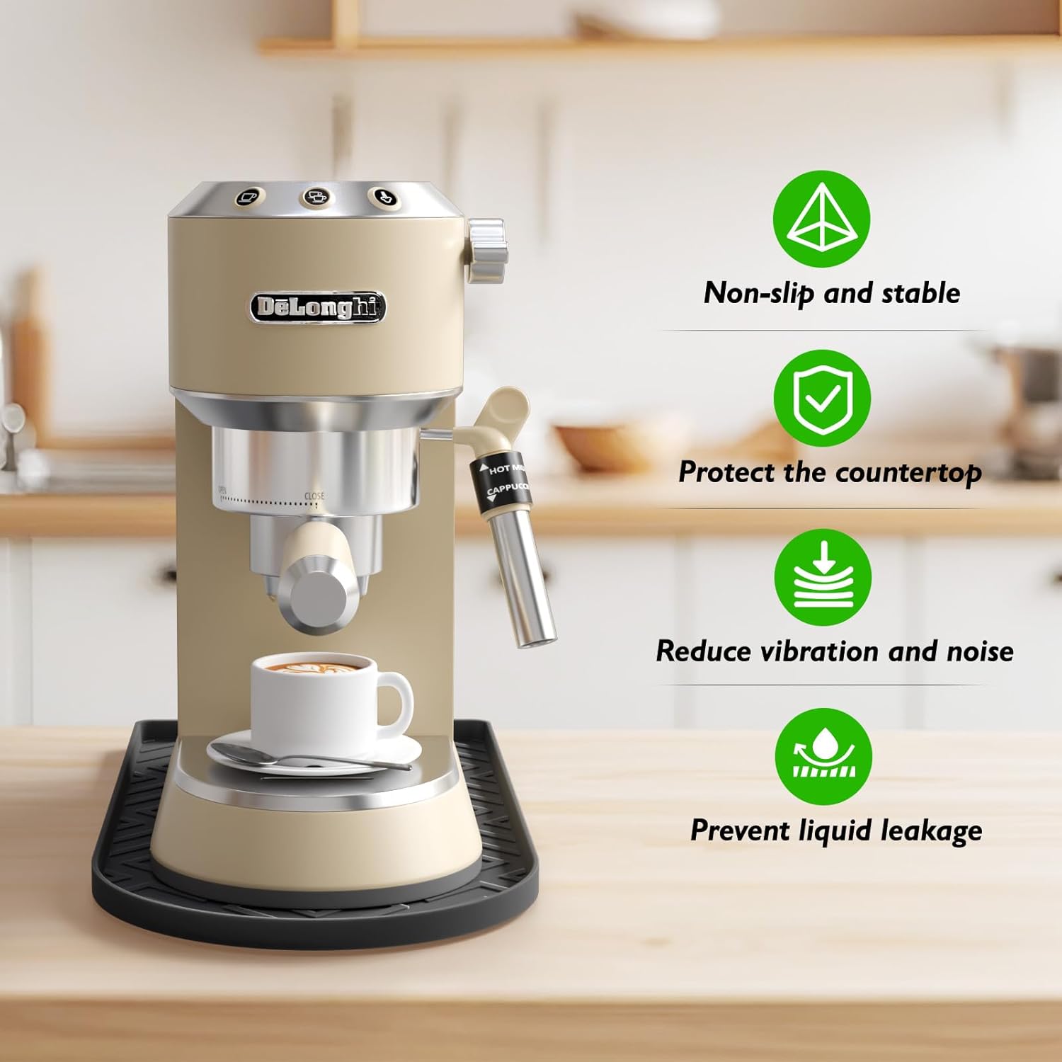 - Precise Arc Design for Perfect Fit:Tailored to match the curved base of most coffee machines, this silicone coffee mat fits snugly without slipping or shifting. It fully covers the contact area, preventing scratches on your countertop while keeping the coffee machine stable during use